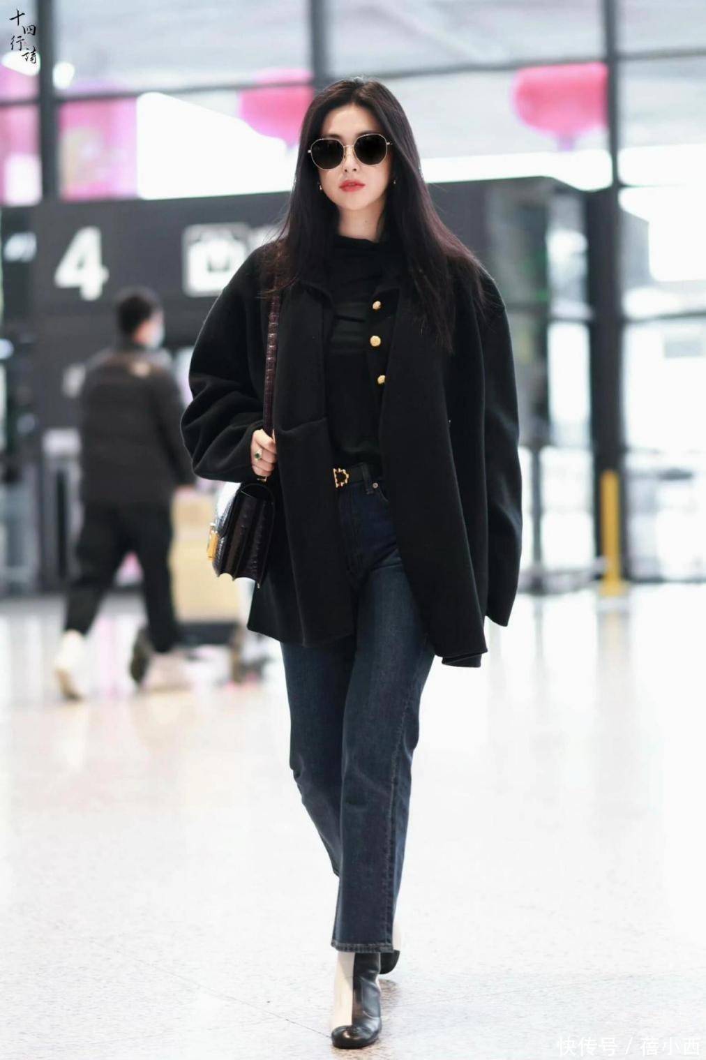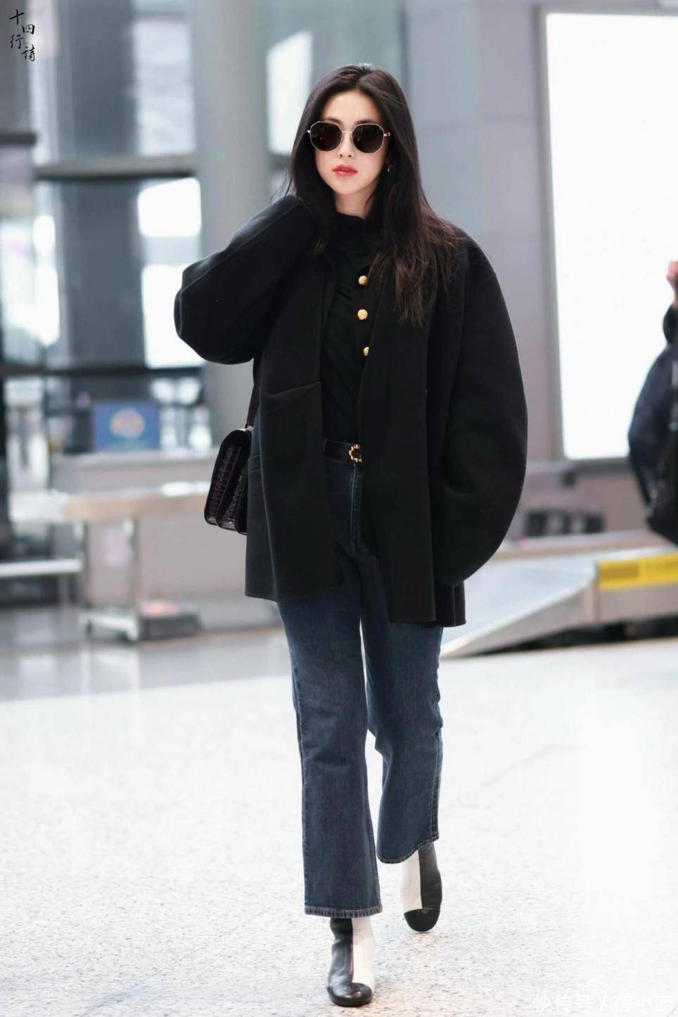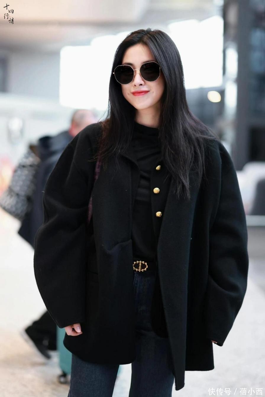 此外,这一身全黑穿搭也很值得借鉴,黑色短款大衣是造型的核心,宽松落肩版型弱化了硬朗感,自带慵懒随性的气质,衣身点缀的金色纽扣是点睛之笔,在纯黑面料上增加了细节,打破了全黑穿搭的沉闷感,外套的短款设计也恰到好处,能优化身材比例,对小个子或梨形身材都十分友好。