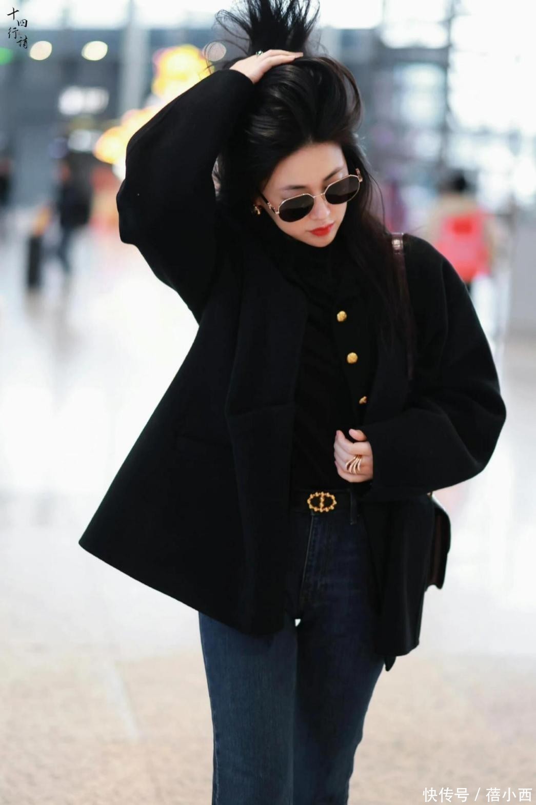 配饰的选择延续了 “少即是多” 的原则,黑色墨镜与红唇形成经典的碰撞,提升了造型的辨识度,黑色腋下包的金属链条与大衣纽扣呼应,让细节更有章法,再加入金色戒指与金属腰带点缀,为全黑造型注入了恰到好处的贵气感。