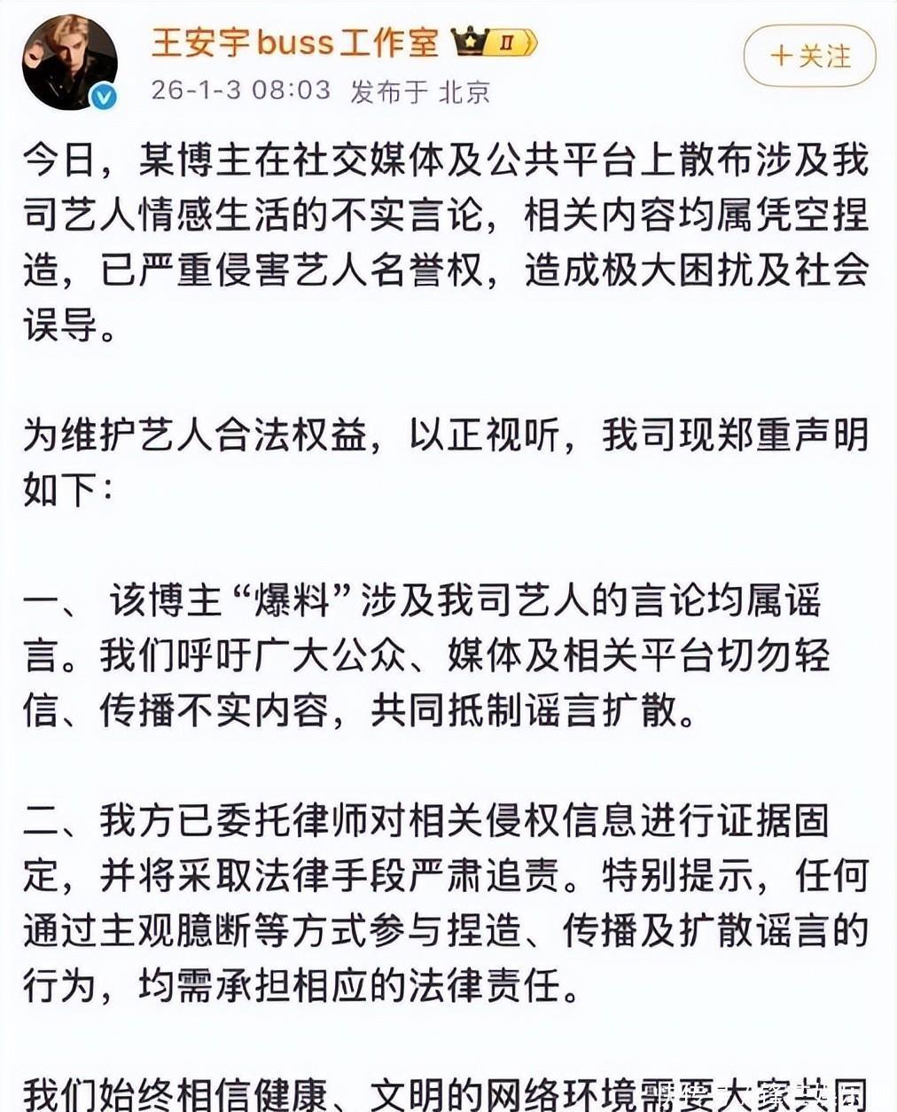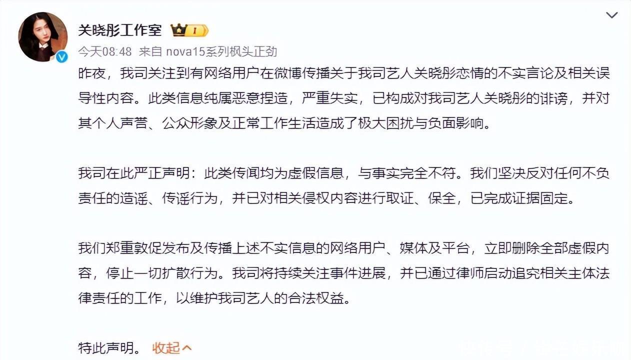 而关晓彤和鹿晗也迅速采取了行动,对网友进行警告,不要传播谣言,她也同样会用司法手段维护自己的名誉。这谣言的另一位主人公王安宇也是很快就发出来了回应公告,内容就和他们都差不多了。