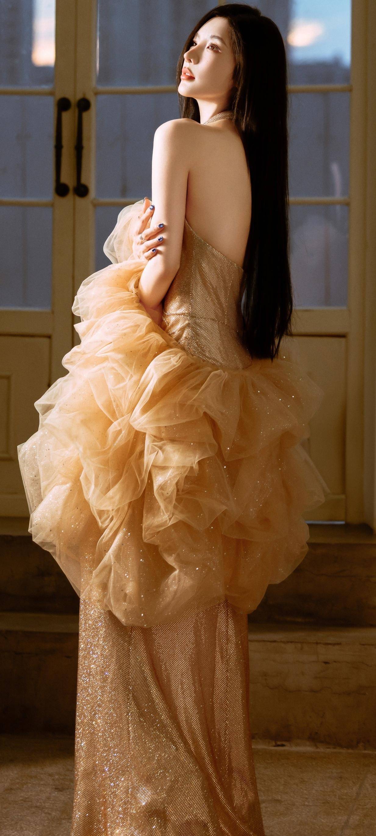 戴燕妮,优雅红唇,金色晚礼服,气质女神!