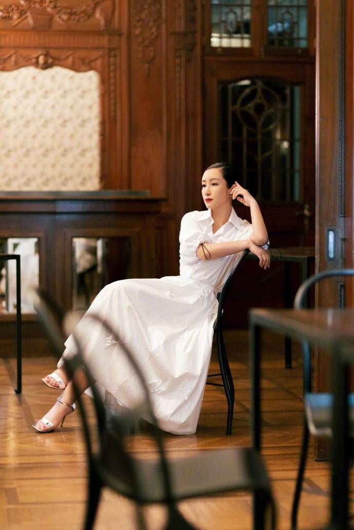 成熟女性若想展现时髦气质,可参考秦海璐这身白色衬衫连衣裙搭配。衬衫连衣裙经典时髦,白色尽显清纯,还能不经意间减龄。搭配高跟鞋,更显成熟。